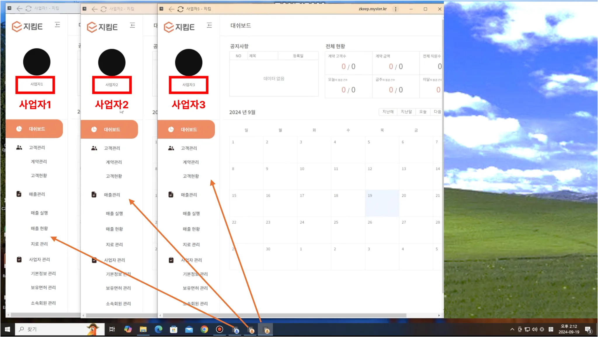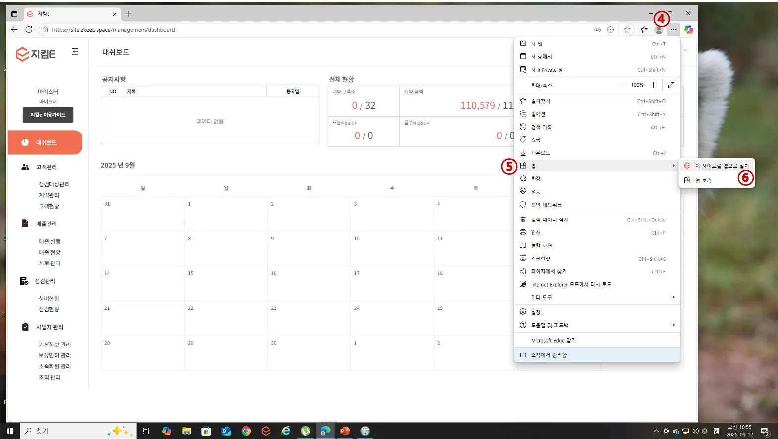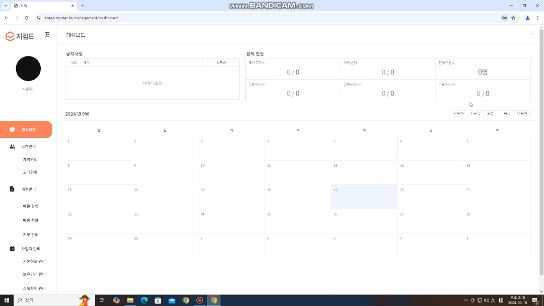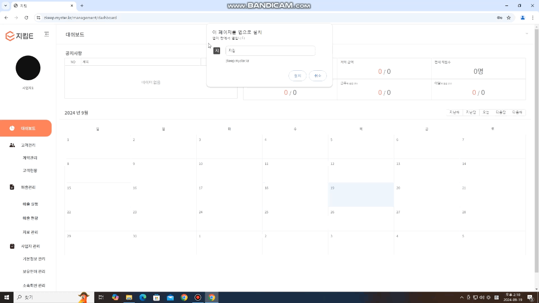 새로운 브라우저 창에서 지킴e 사업자 관리 웹페이지(site.zkeep.space) 접속 > 사업자 계정으로 로그인 해주세요.