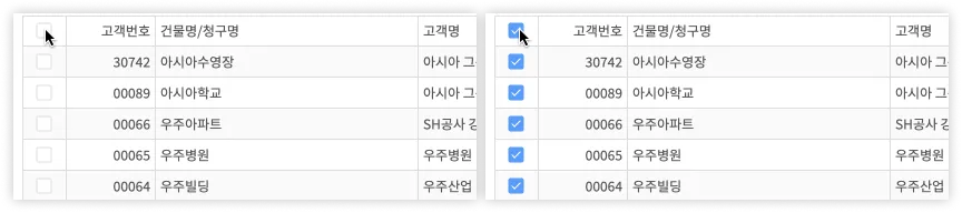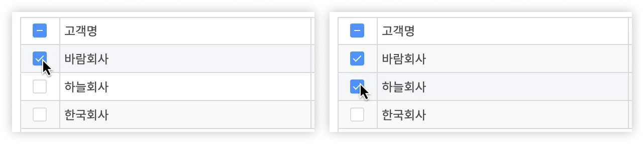 개별 선택은 조회되는 전체 목록 중에서 필요한 목록을 하나씩 개별적으로 선택하는 방식입니다. 사용자가 특정 목록만 선택해야 하는 경우에 적합하며, 개별적으로 선택한 항목에 대해 집중적으로 기능을 처리할 수 있습니다.