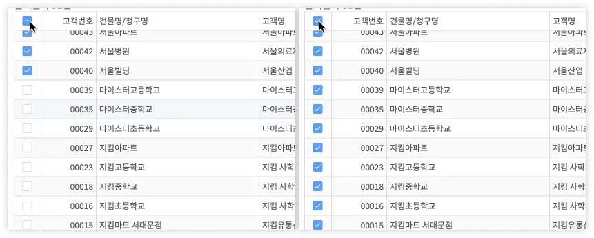 아래로 스크롤한 후 체크되지 않은 항목이 있으면, 다시 최상단 체크박스를 클릭하여 이후에 표시된 모든 항목을 선택할 수 있습니다.