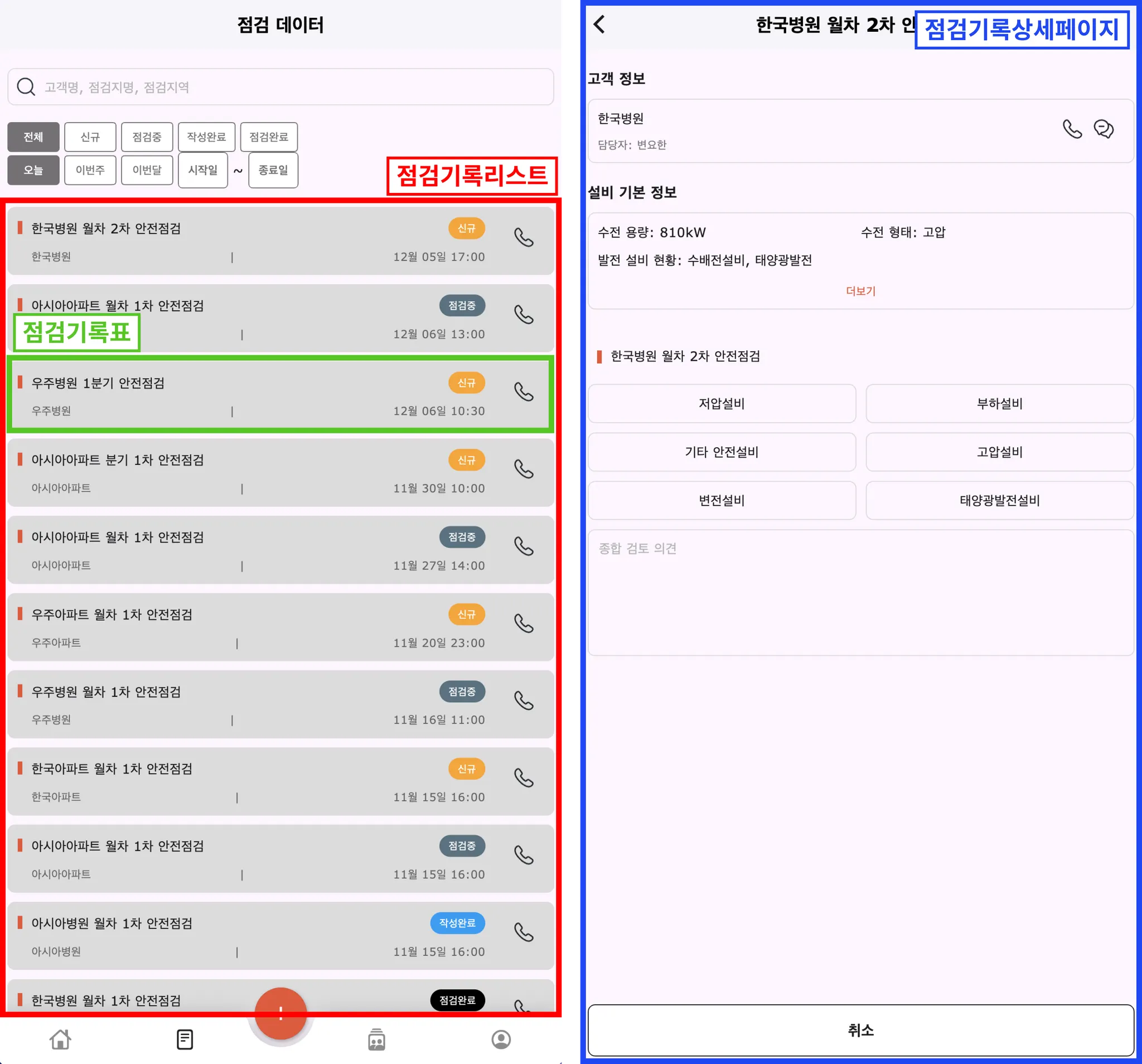 상태 표시: 각 점검기록의 진행 상태를 색상, 아이콘 또는 태그로 명확히 구분하여 시각적 편의성을 제공합니다.