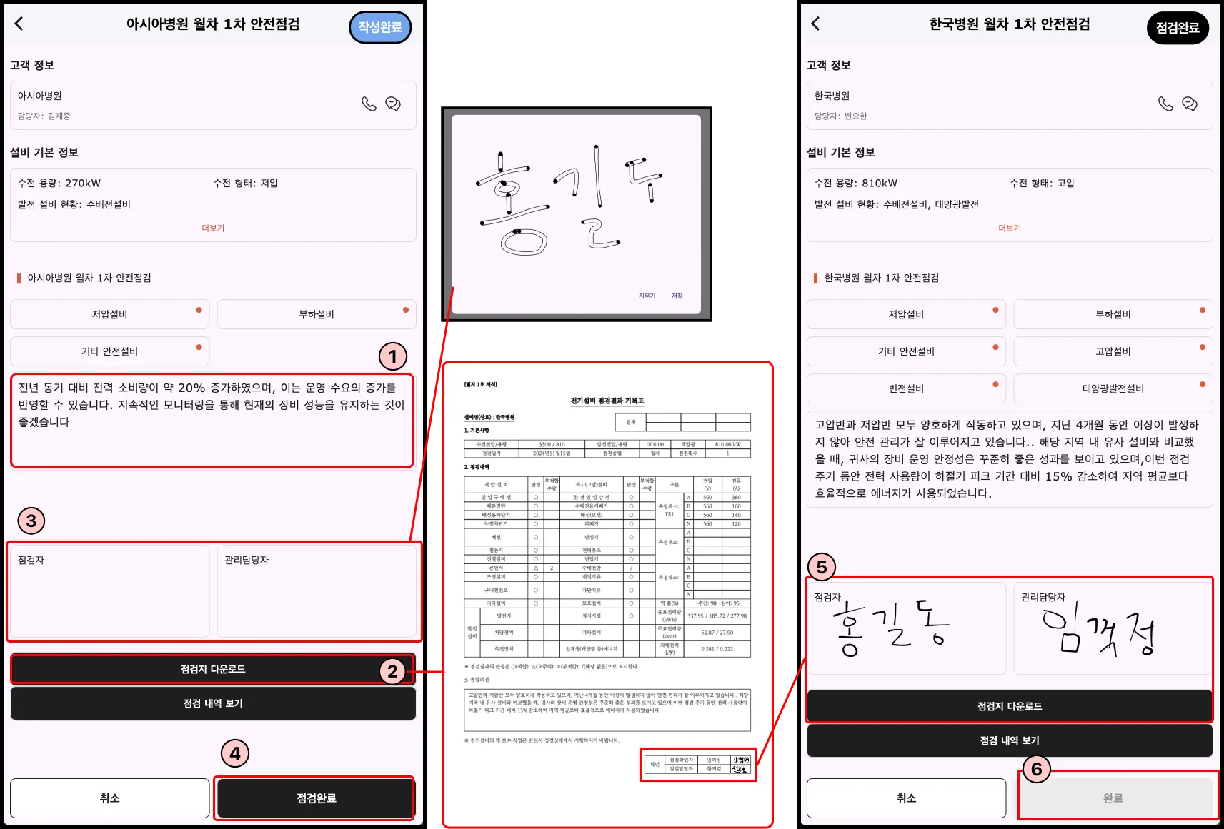 점검결과 검토 및 서명: 작성 완료된 점검기록을 검토하고 점검자 및 관리담당자가 서명 가능