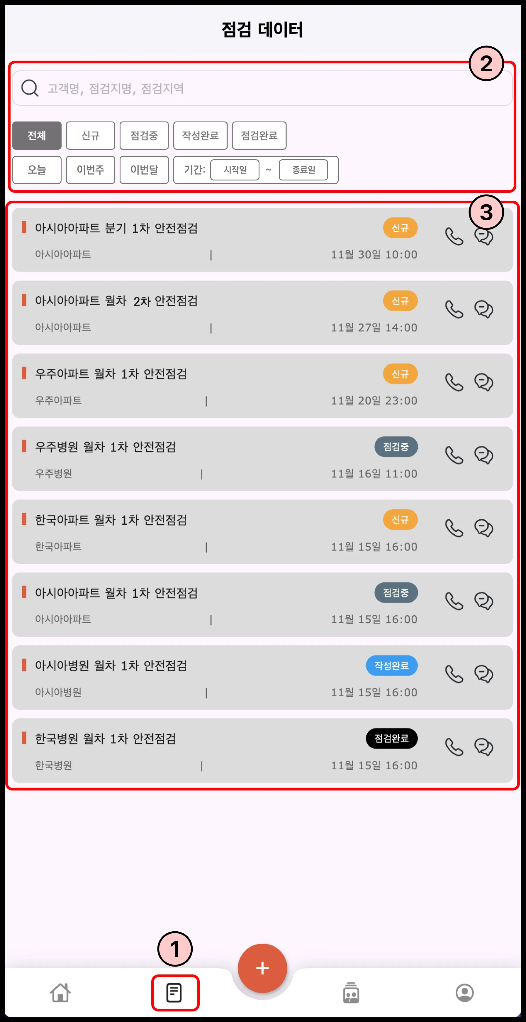 예: 날짜별, 고객별, 점검 상태별 등 다양한 필터링 옵션 제공.