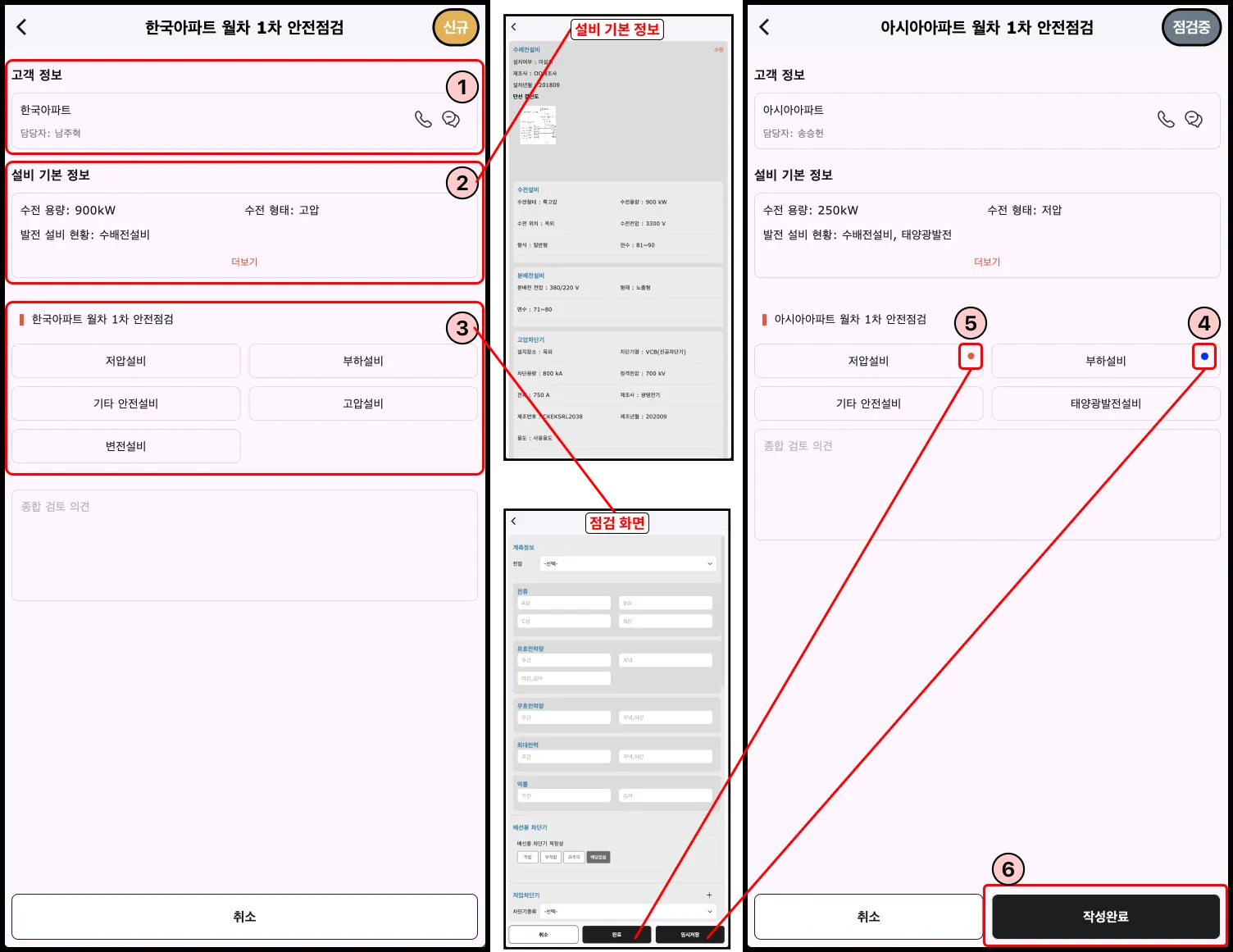 해당 점검대상 설비에 대한 기록이 완료되면 ⑥ 「작성완료」 버튼 클릭합니다.