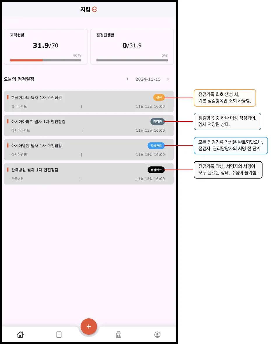 점검기록은 신규 - 점검중 - 작성완료 - 점검완료의 4단계로 나뉘며, 각 단계는 점검기록의 진행 상태를 체계적으로 관리하고 추적하기 위한 기준입니다. 각 점검기록의 단계별 상태를 명확히 구분하여 현재 진행 상황을 쉽게 확인하고, 점검의 효율성과 정확성을 높일 수 있습니다. 이를 통해 점검자는 작업 진행 상황을 한눈에 파악하고, 관리자는 기록 상태를 기반으로 후속 작업을 원활하게 계획할 수 있습니다.