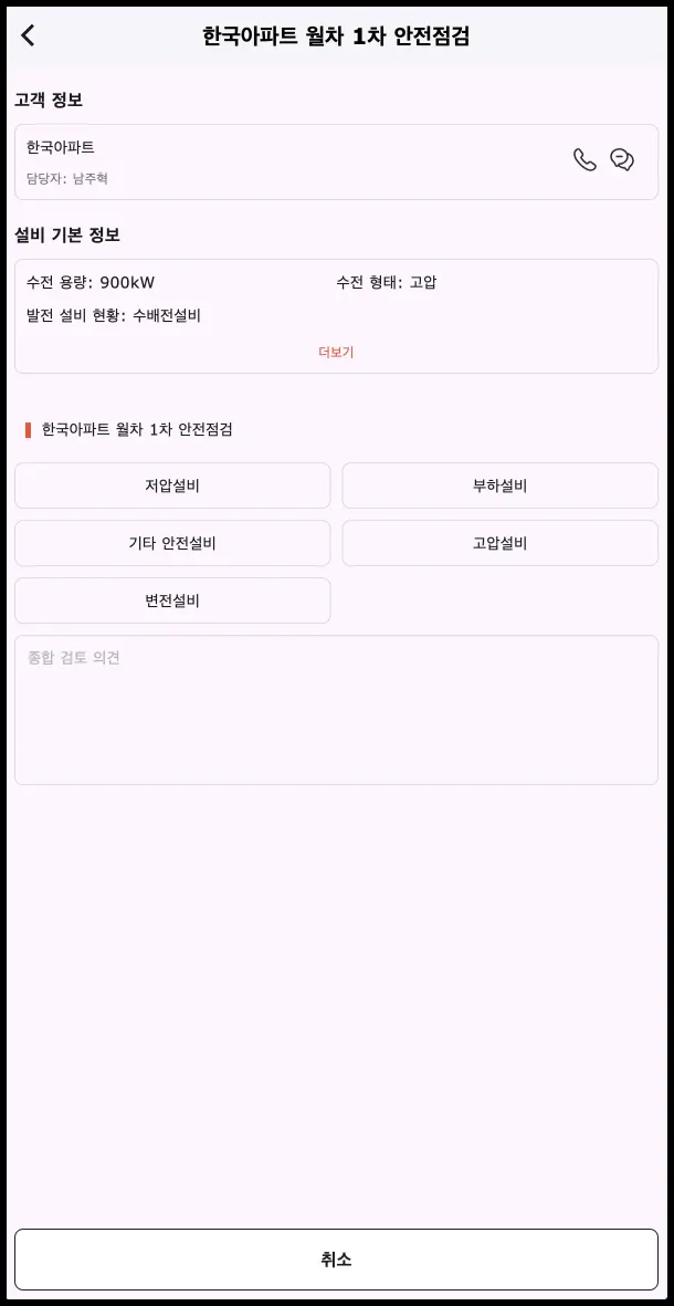 개요: 점검기록이 처음 생성된 후, 해당 현장의 기본 점검정보만 조회되는 초기의 점검기록 상태입니다.