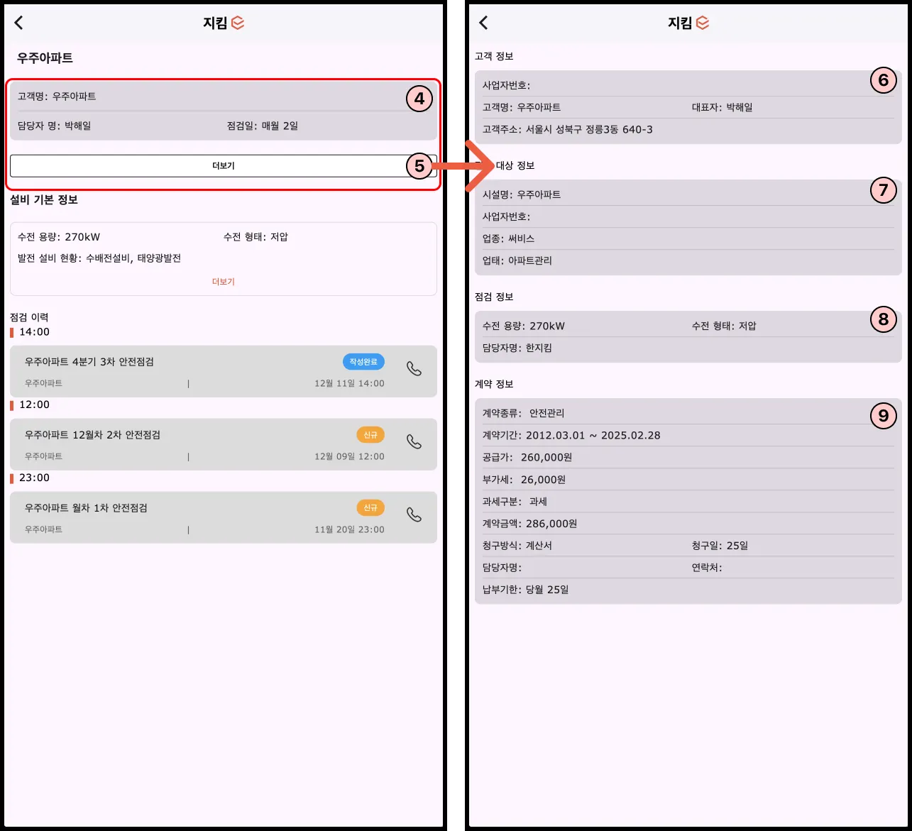 상세정보 확인: ⑤ 「더보기」 버튼 > 고객 상세정보 페이지 이동