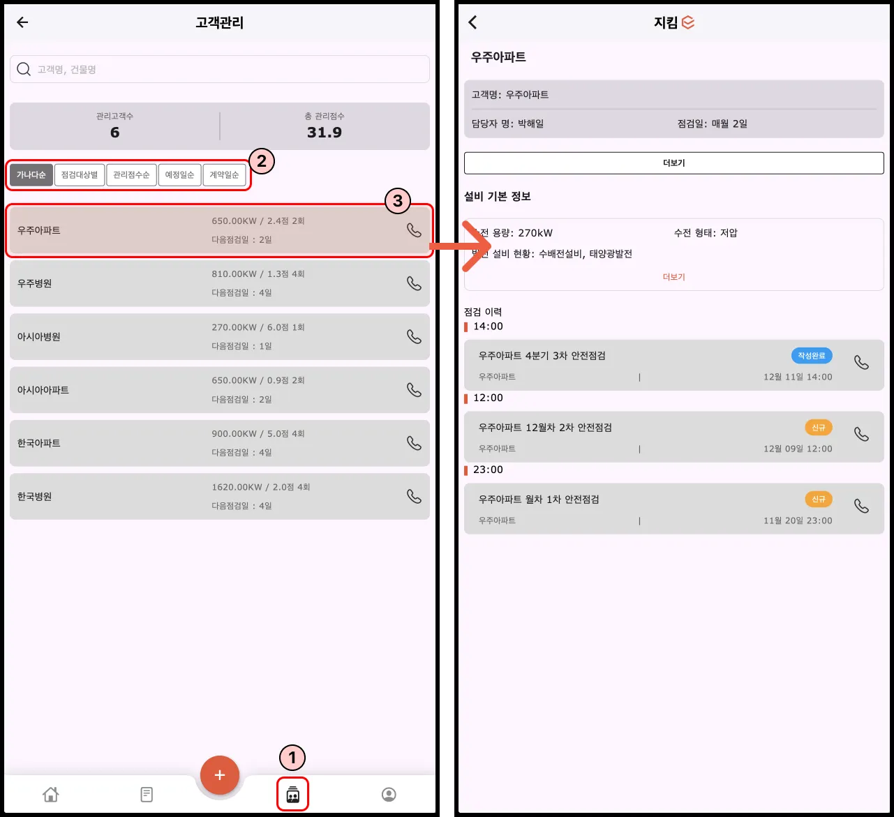 조회 필터 설정: 관리점수순, 최근 점검일순, 거리순 등으로 정렬해 원하는 고객 선택.