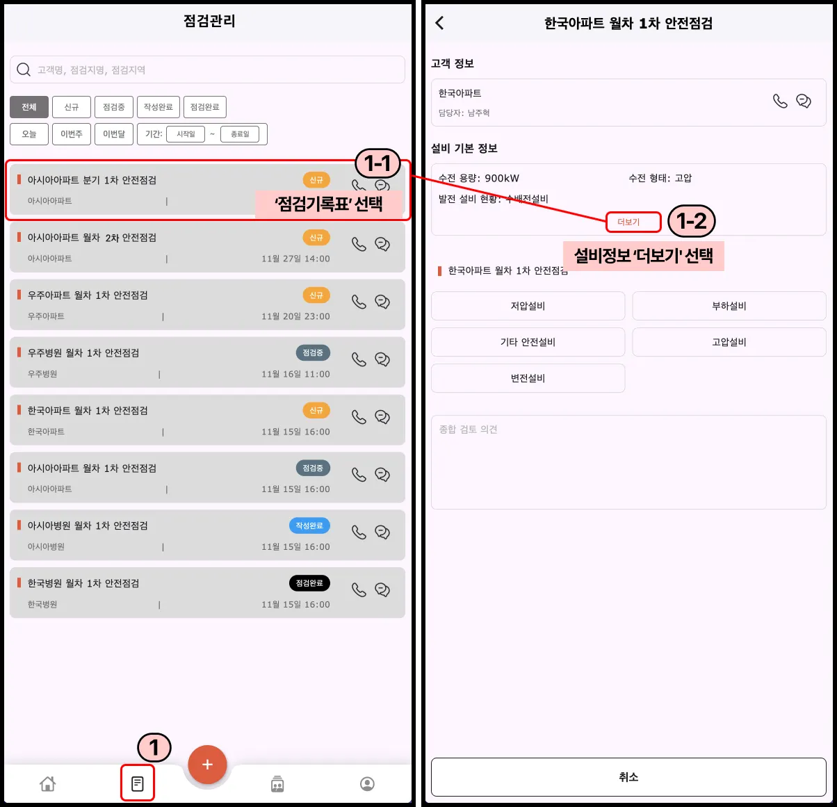 ① 점검관리 페이지 > ①-1 점검기록표 선택 > ①-1 설비정보 「더보기」 클릭