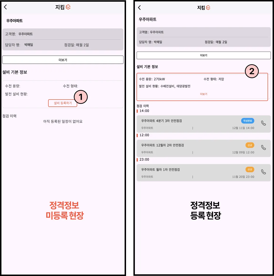 지킴E 앱에서는 설비 정보를 손쉽게 조회하고 관리할 수 있도록 다양한 접근 경로를 제공합니다. 점검관리 및 고객관리 페이지에서 설비 정보를 빠르게 확인할 수 있으며, 이를 통해 설비 상태 및 정보의 실시간 업데이트가 가능합니다.
