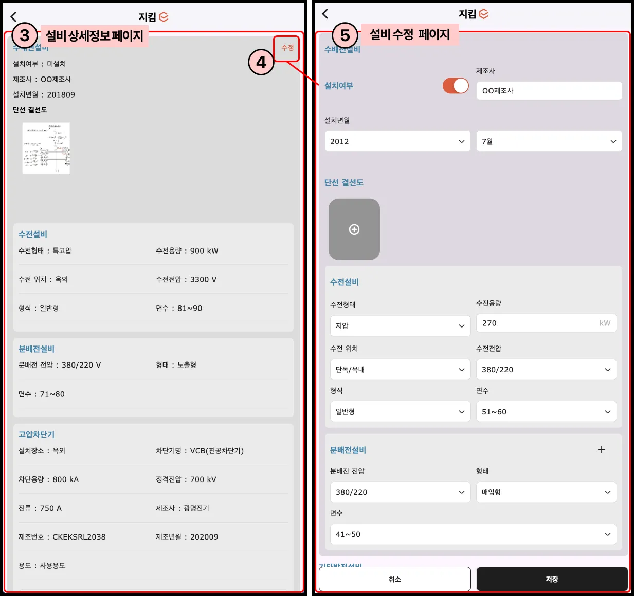 (아래의 3. 설비상세정보 페이지 > ⑤설비수정 페이지 참고)