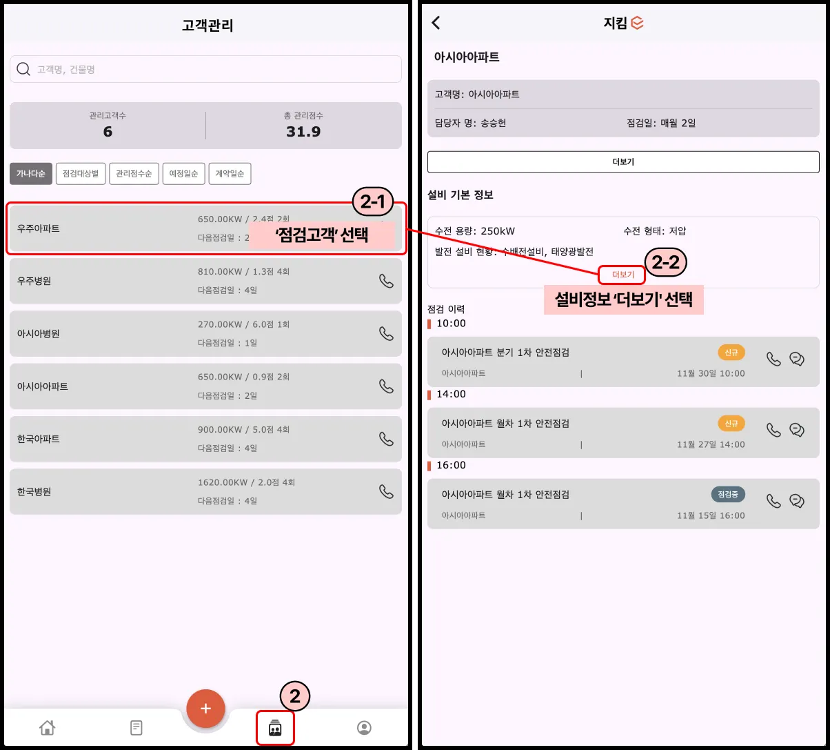 ② 고객관리 페이지 > ②-1 점검고객 선택 > ②-2 설비정보 「더보기」 클릭
