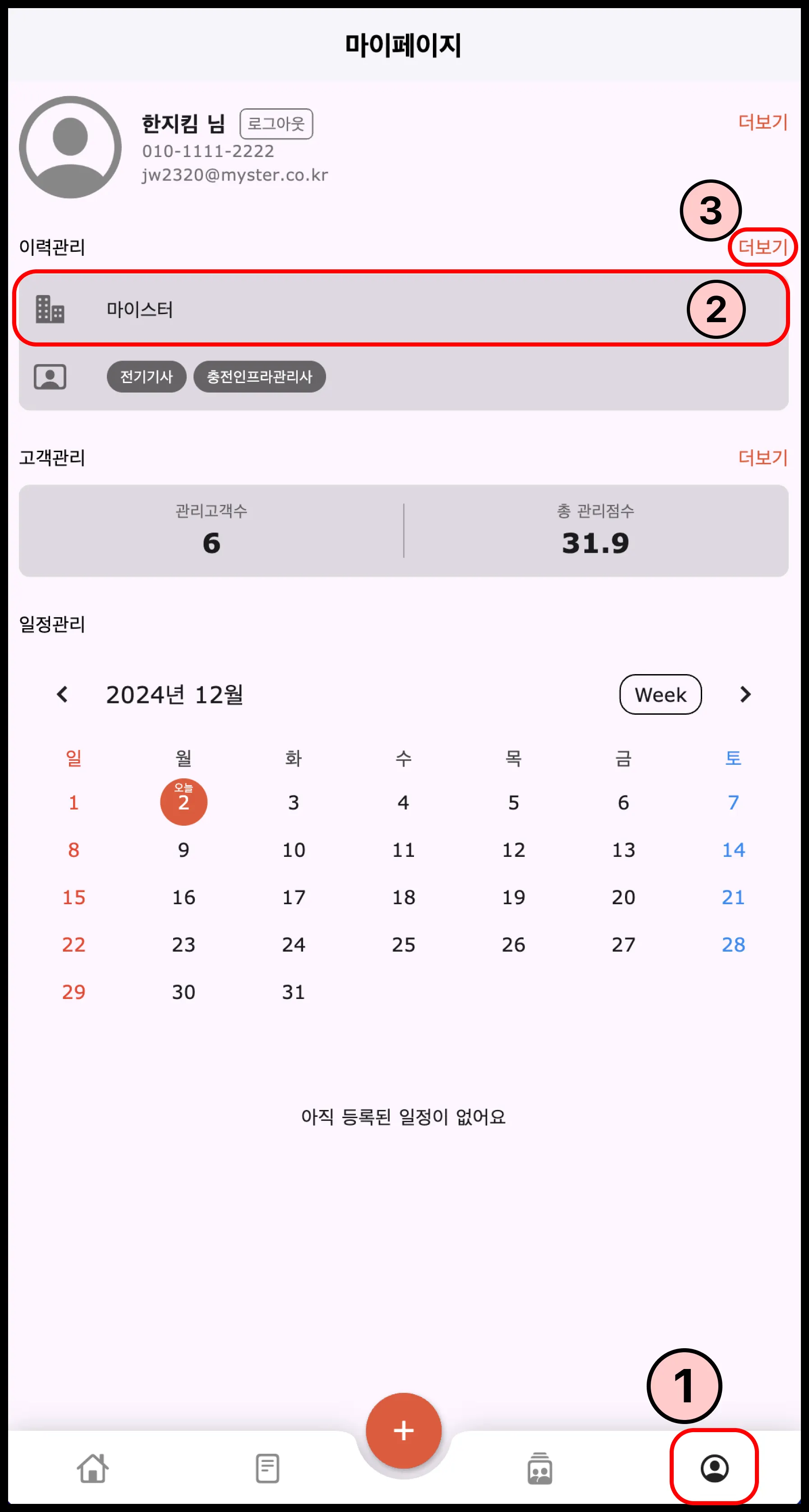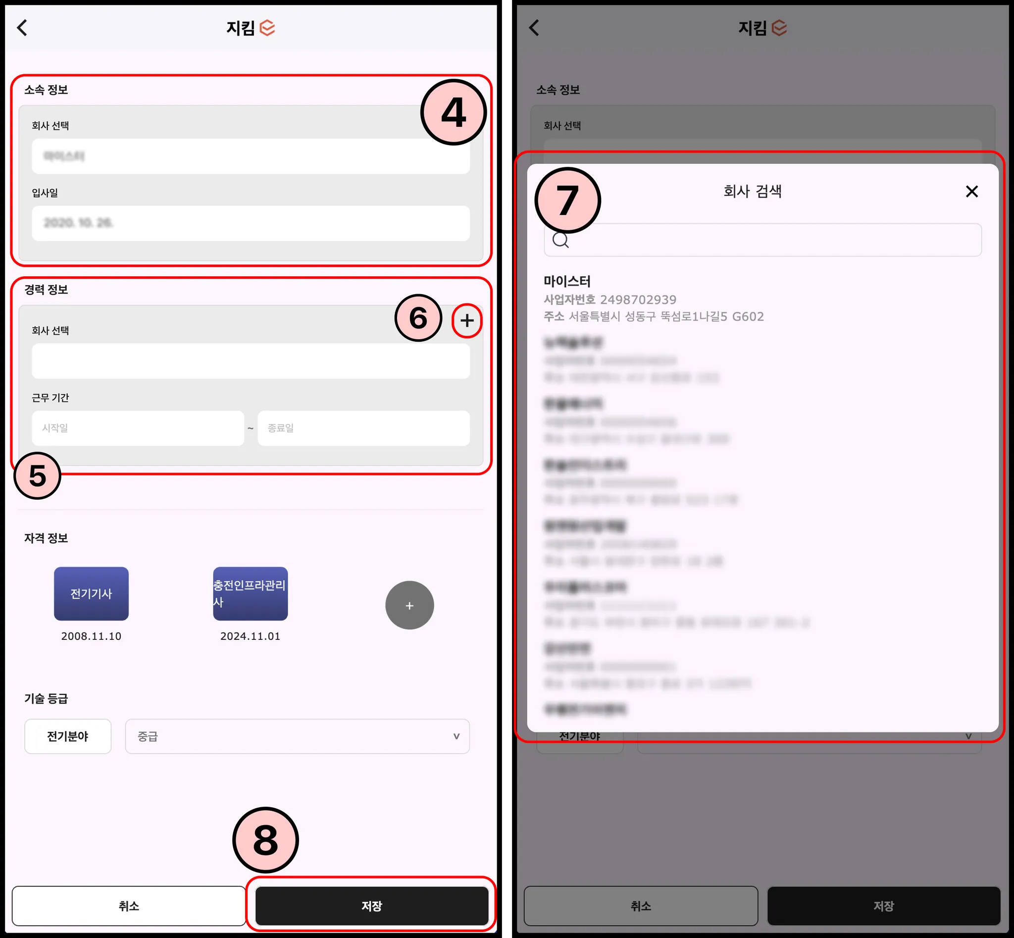 경력정보관리를 통해 사용자는 현 소속과 보유 자격증 정보를 한눈에 확인할 수 있습니다. 더보기 버튼을 클릭하면, 현 소속과 상세한 경력을 손쉽게 입력할 수 있습니다. 대부분의 회사 정보는 미리 등록되어 있어, 검색 후에 회사명과 사업자번호, 주소지를 확인하고 선택함으로써 경력 정보를 보다 정확하고 체계적으로 관리할 수 있습니다.