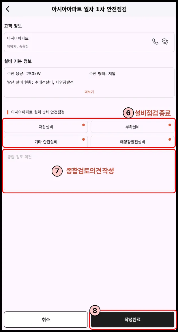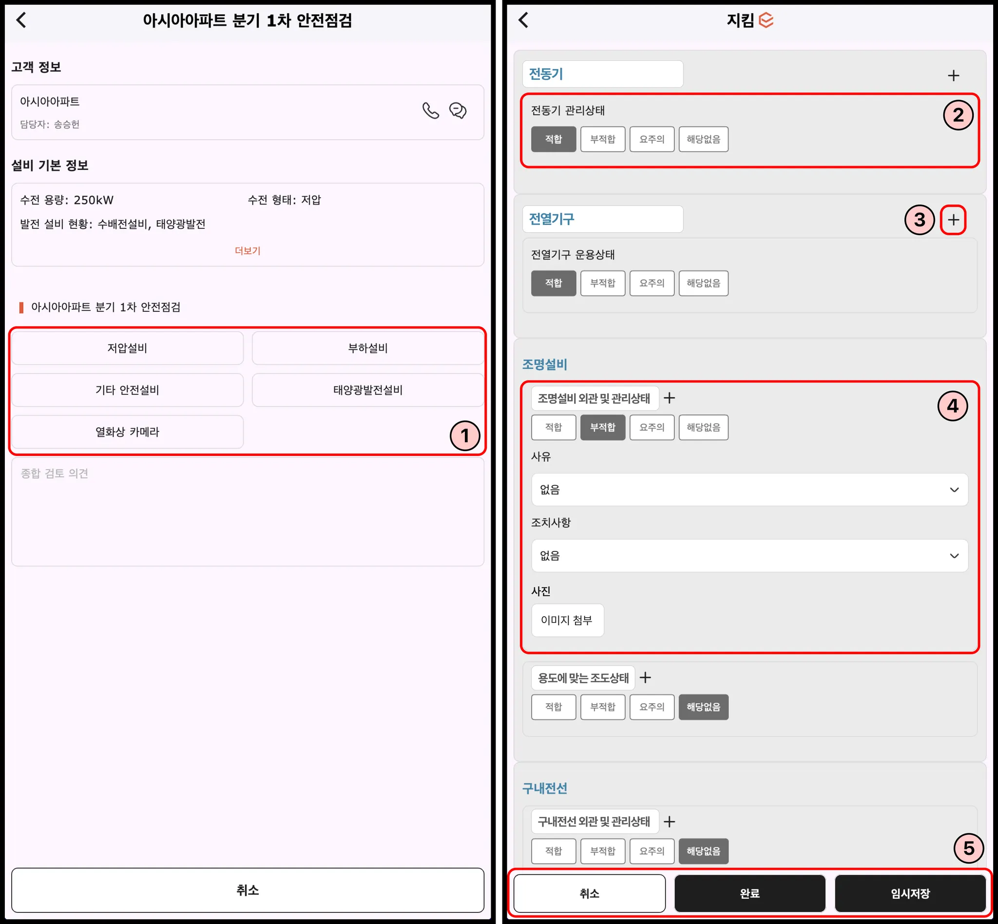 완료: 설비 점검이 완료할 때 클릭 (① 점검설비 목록에 빨간점 「•」 생성)