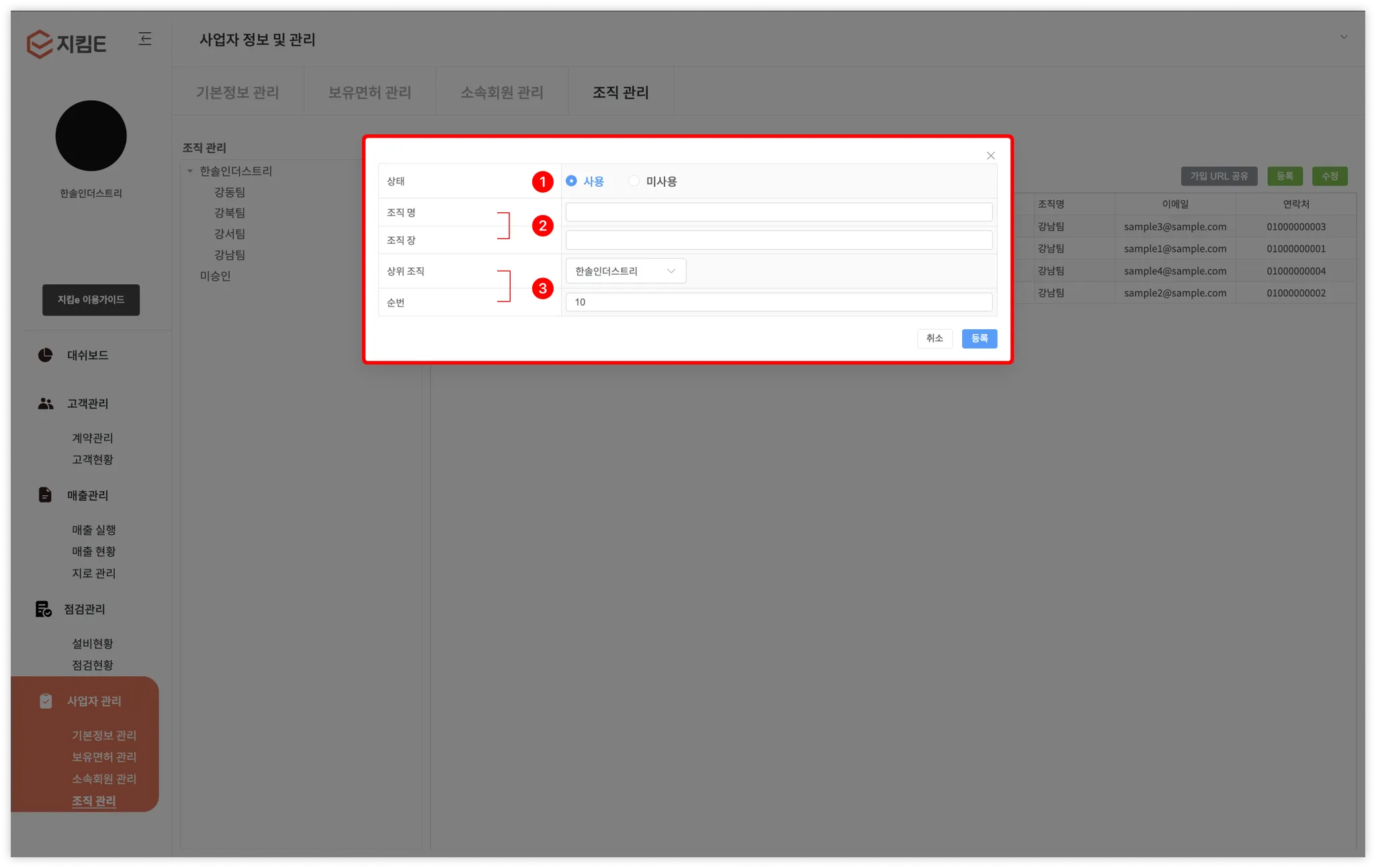 새로운 조직을 등록하거나, 기존 조직의 정보(위계, 조직명 등)을 수정할 수 있는 기능이 제공됩니다.