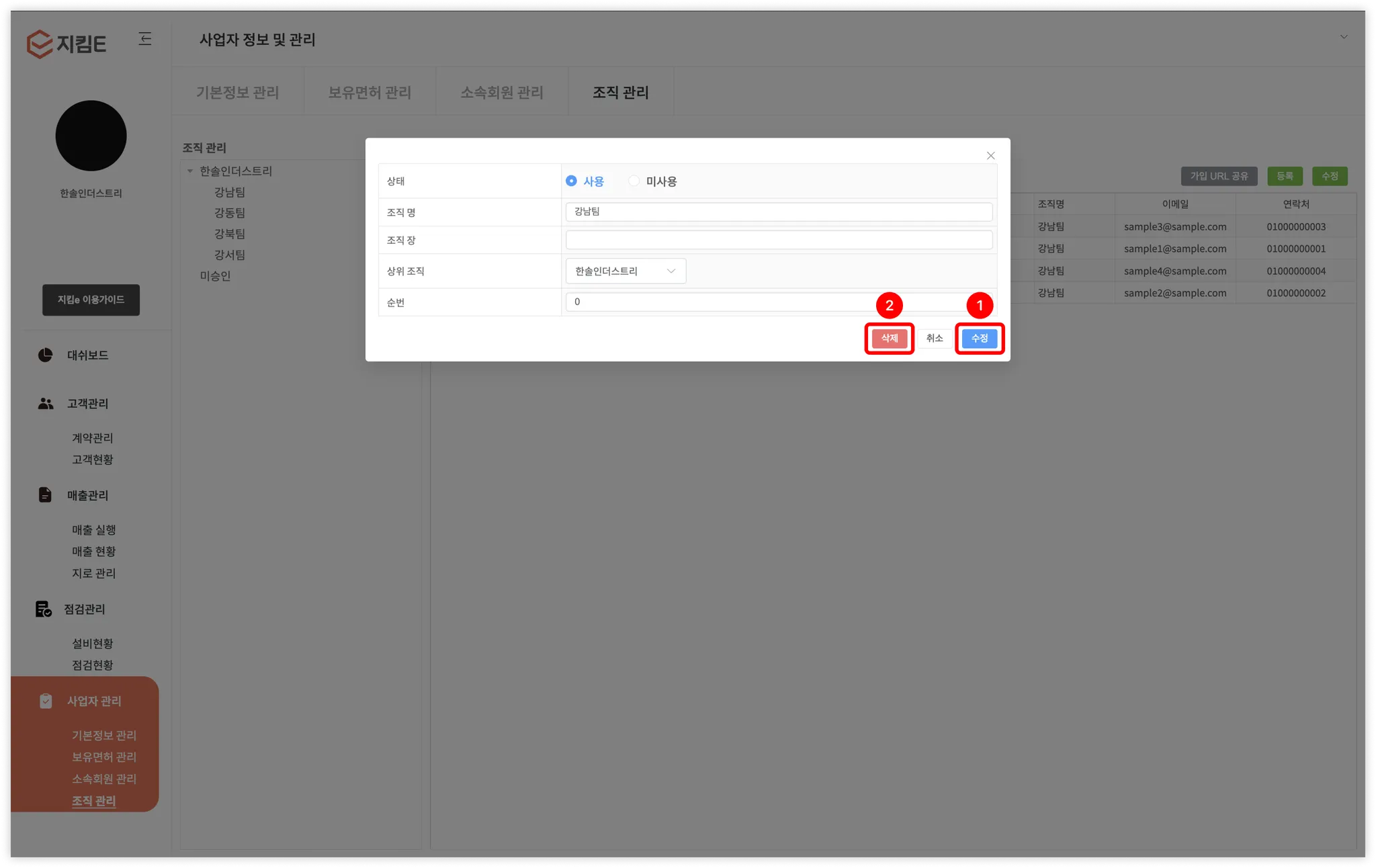조직 수정 및 삭제 창
