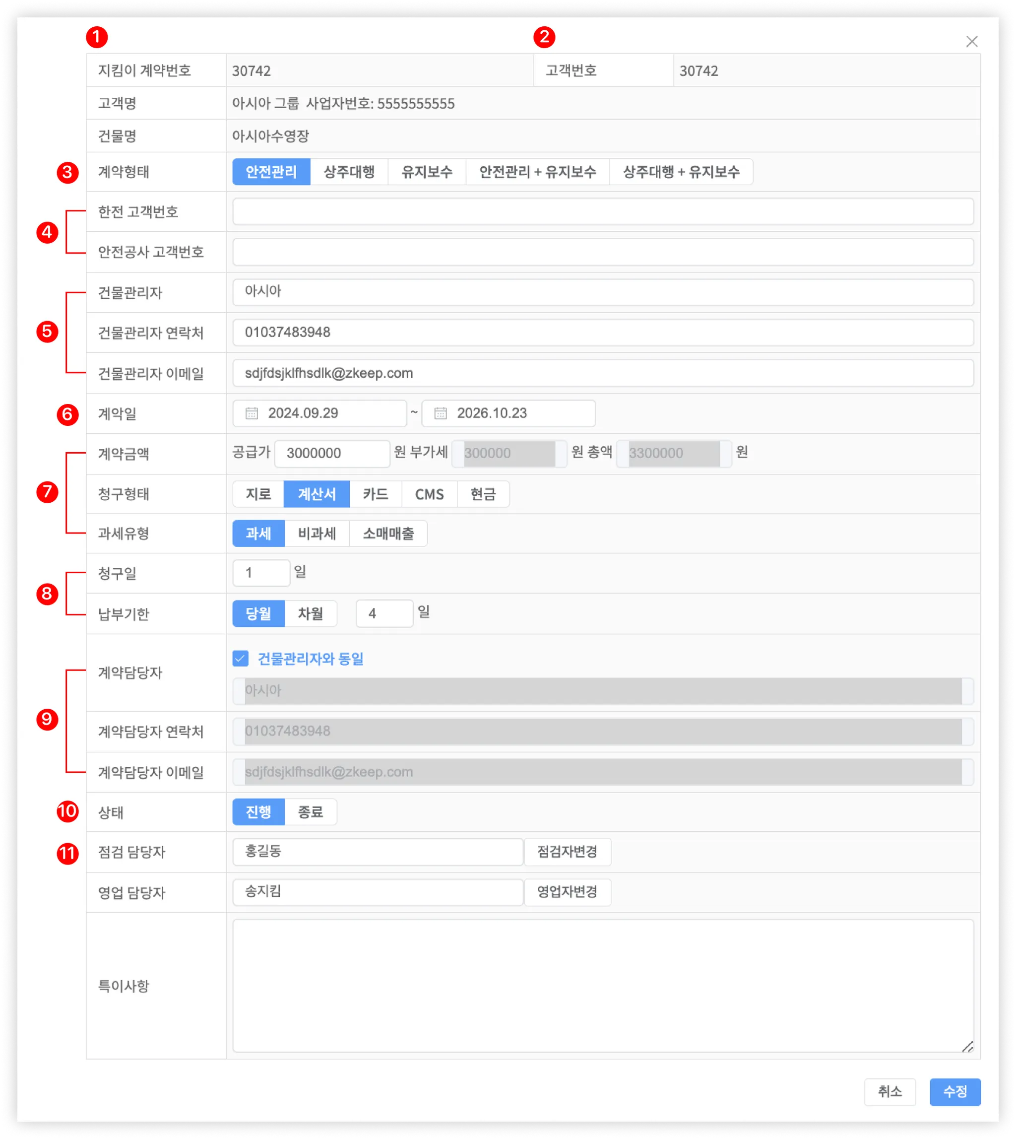 계약기간에 따른 계약의 유효성 및 안전점검 대행 권한, 비용청구 주기, 업무 스케줄 설정에 활용됩니다.