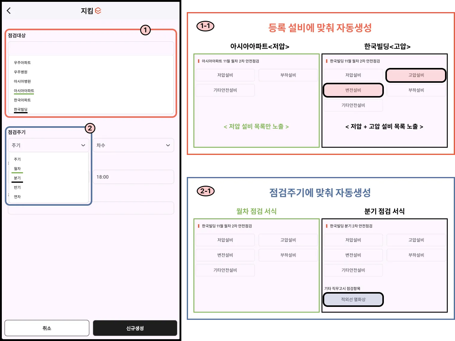 아래의 ①,② 자동 생성 프로세스의 설정에 따라 ①-1 & ②-1의 점검서식이 자동으로 생성됩니다