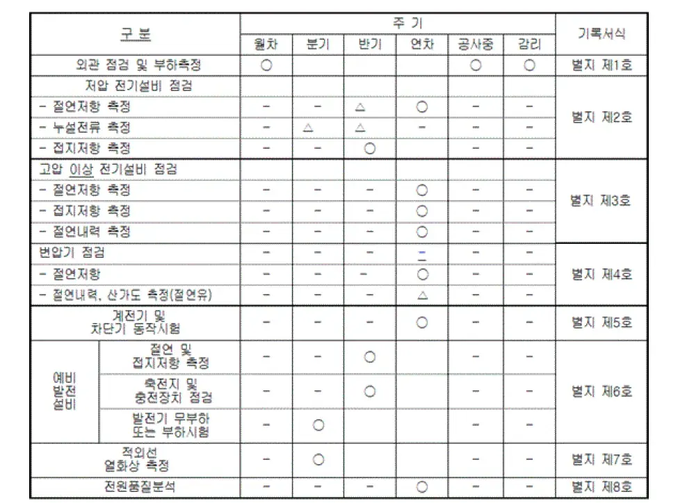 지킴E는 점검 기록을 생성할 때, 점검 대상 및 점검 주기 등에 따라 설비별(별지 9호~16호)와  주기별(별지1호~8호)에 대응하는 기록표가 자동으로 반영되어 생성됩니다. 이를 통해 점검자는 매번 점검할 때마다 복잡한 설비목록에 대한 추가와 등록과정이 없이 바로 점검기록을 작성할 수 있으며, 점검 주기에 맞는 적절한 양식이 적용됩니다.