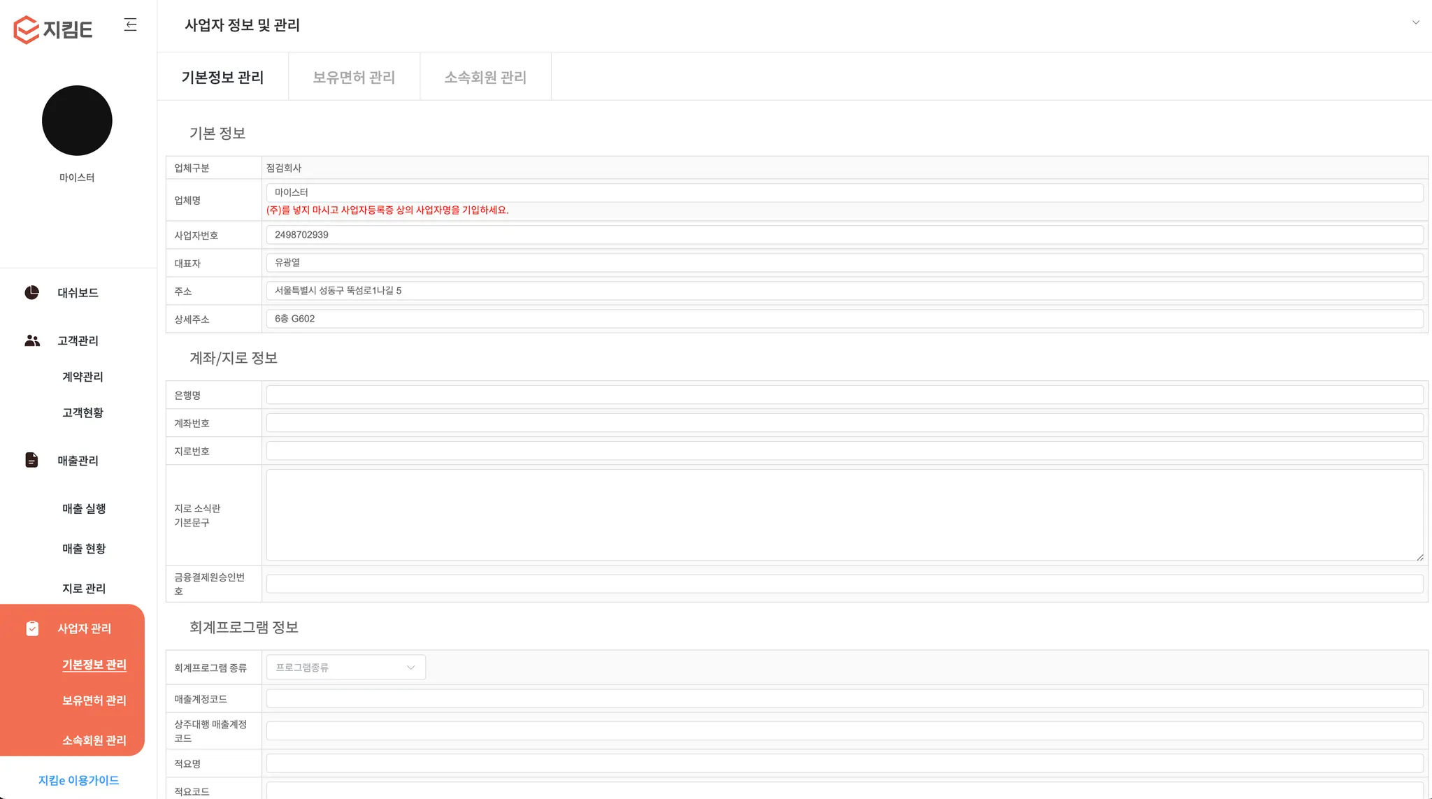 가입 정보입력 창이 열리면 가입하실 사업자 계정의 가입 정보를 입력해주세요.