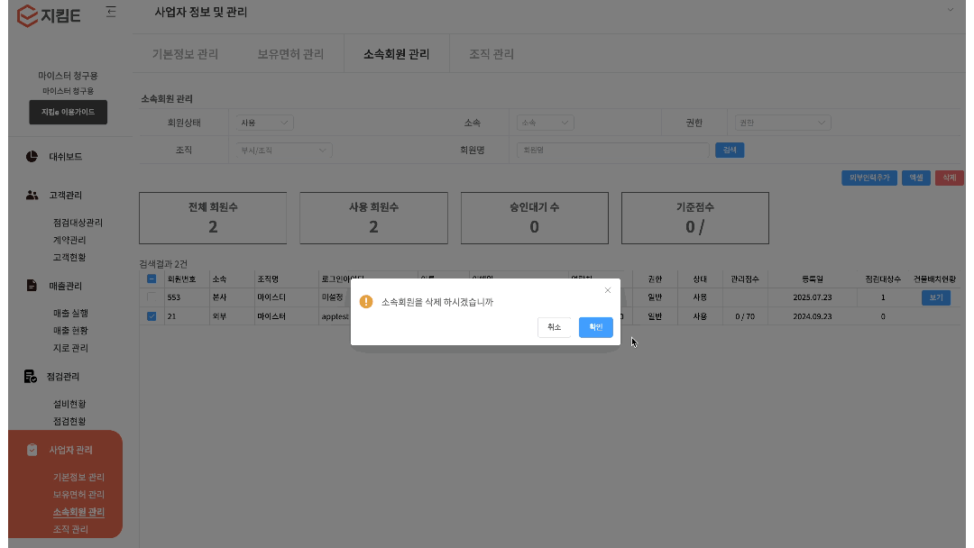 소속회원 목록에서 삭제할 외부 소속 회원 체크박스를 선택 후, 삭제 버튼을 클릭해주세요.