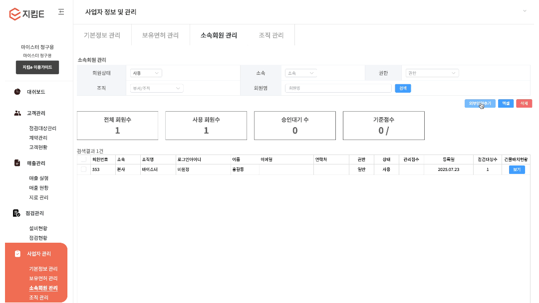 소속회원 목록에서 추가된 인원의 등록여부 확인