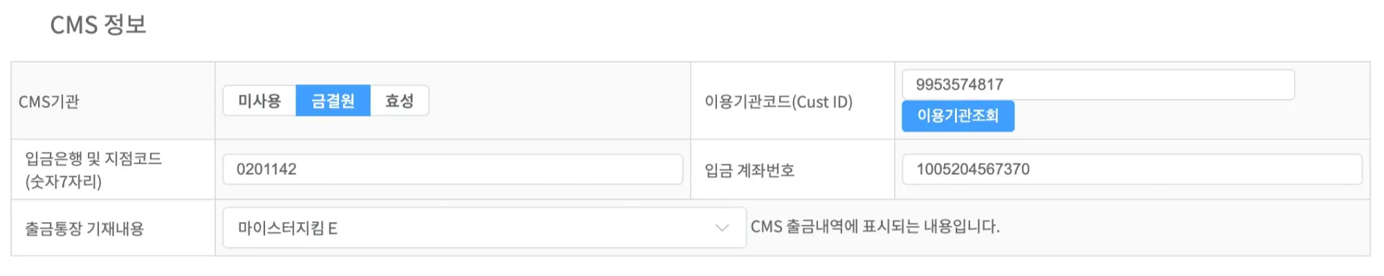 1) [CMS 기관]에서 금결원 선택.