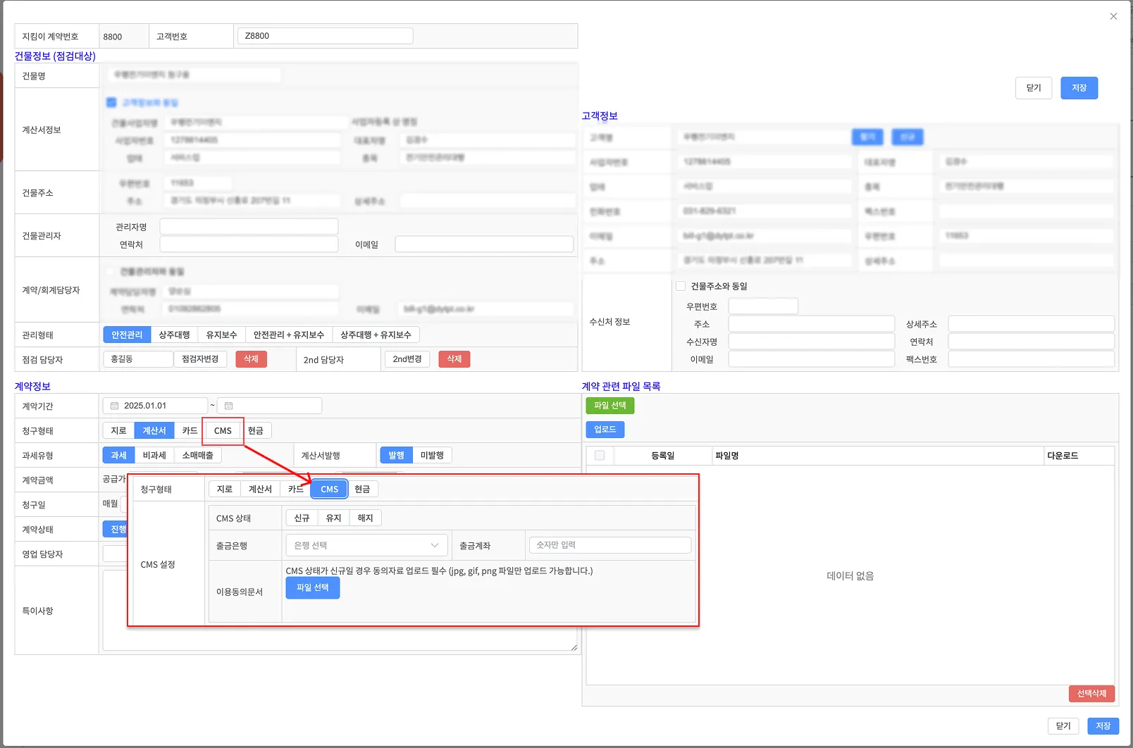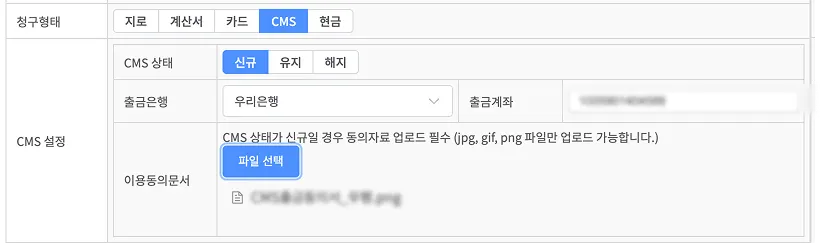 CMS 청구를 하기 위해서는 사전에 CMS 이용기관 등록이 되어 있어야 합니다. 위 링크를 클릭하시면 이용기관 정도 등록방법을 확인할 수 있습니다.